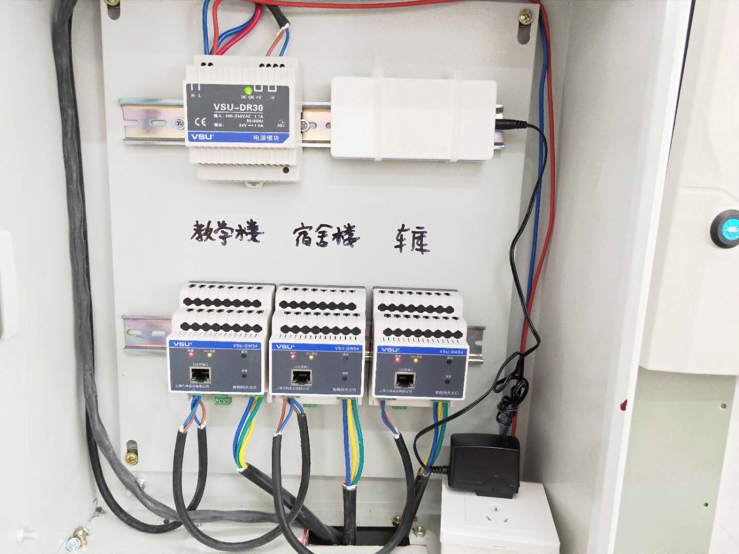 如上圖所示教學(xué)樓、宿舍樓、車庫(kù)等地分別配了一只智能網(wǎng)關(guān)模塊。