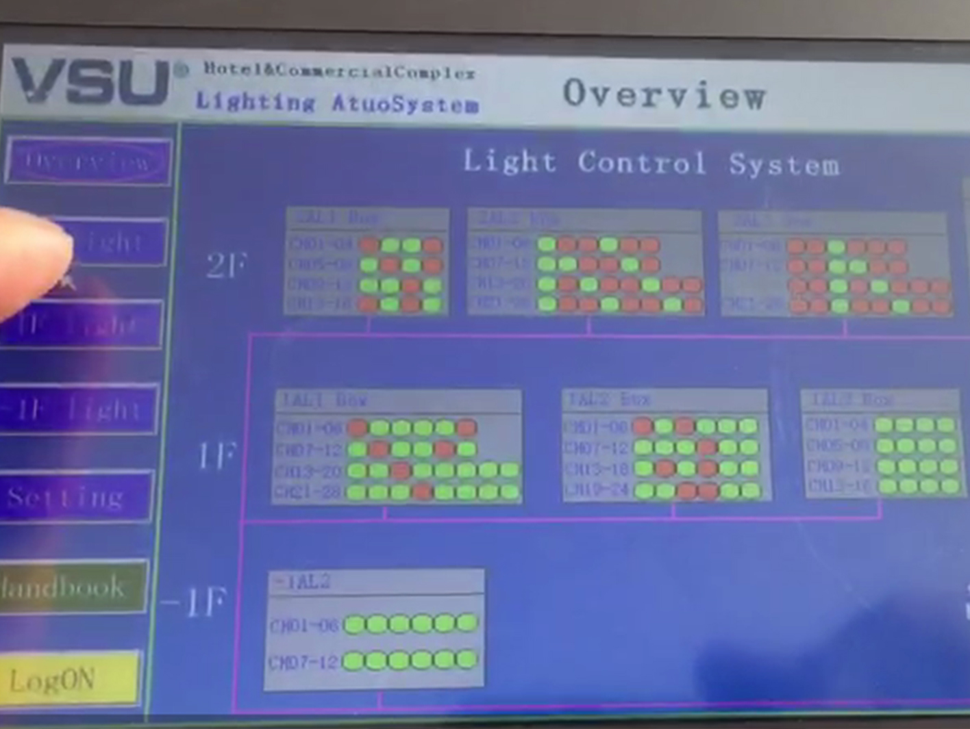 該項(xiàng)目位于老撾,使用VSU總線型智能照明控制系統(tǒng)的系列產(chǎn)品:4路、8路、16路16A智能照明模塊、網(wǎng)關(guān)主機(jī)、級(jí)聯(lián)模塊、7寸觸摸屏。通過(guò)現(xiàn)場(chǎng)安裝的7寸觸摸屏可對(duì)處理建筑所有燈具的開(kāi)關(guān)控制,并能實(shí)時(shí)觀察到異常燈具的出現(xiàn),盡早安排維修,降低安全隱患。采用VSU智能照明控制系統(tǒng),將普通照明人為的開(kāi)關(guān)轉(zhuǎn)換成為智能化管理,不僅使管理者能將其高素質(zhì)的管理意識(shí)運(yùn)用于照明控制系統(tǒng)中去,而且同時(shí)能很大程度上減少商務(wù)大廈的運(yùn)行維護(hù)費(fèi)用。