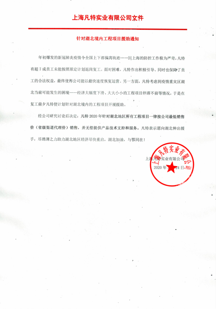 經(jīng)公司研究討論后決定:凡特2020年針對(duì)湖北地區(qū)所有工程項(xiàng)目一律按公司最低銷(xiāo)售價(jià)(省級(jí)渠道代理價(jià))銷(xiāo)售,并無(wú)償提供產(chǎn)品技術(shù)支持和服務(wù)。凡特表示愿向湖北伸出援手,盡綿薄之力助力湖北地區(qū)經(jīng)濟(jì)盡快重啟,湖北加油,與鄂同在!