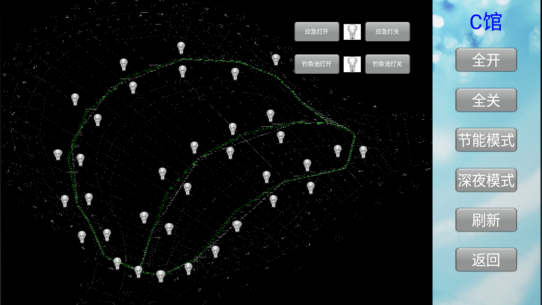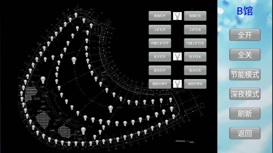智能照明控制系統(tǒng)對各個場館內(nèi)的照明納入到統(tǒng)一的系統(tǒng)平臺進行集中管理,實現(xiàn)一鍵全開全關(guān),游樂園可根據(jù)不同節(jié)日預設(shè)不同燈光場景,增添假日氣氛,也可根據(jù)客流量預設(shè)燈光(如下圖:節(jié)能模式),在保持照明需求以及氛圍感的同時,實現(xiàn)節(jié)能減排。