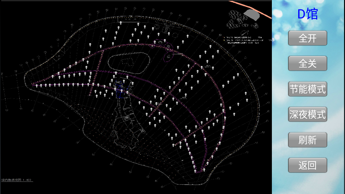 根據(jù)夏日晝長夜短、冬日晝短夜長的氣候特點以及開館、閉館的時間,預設(shè)燈光自動亮起、關(guān)閉的時間,避免忘關(guān)、漏關(guān)等現(xiàn)象;深夜客流量少時根據(jù)部分場館的需求可預設(shè)其所需的亮度(如下圖:深夜模式)