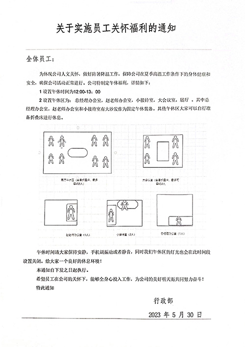 公司設(shè)置了午休區(qū)并購置了"午休神器",神器寬大柔軟,如折疊睡墊;配備的緩解頸部勞累的充氣枕,釋放了上午工作的疲勞。讓員工在午休時(shí)間休息好,養(yǎng)足精神,不是一件小事。該通知讓員工感受到了企業(yè)大家庭的溫暖,也是企業(yè)人文關(guān)懷的真情體現(xiàn),獲得大家的一致好評(píng)點(diǎn)贊,也使得下午的工作更加投入用心。