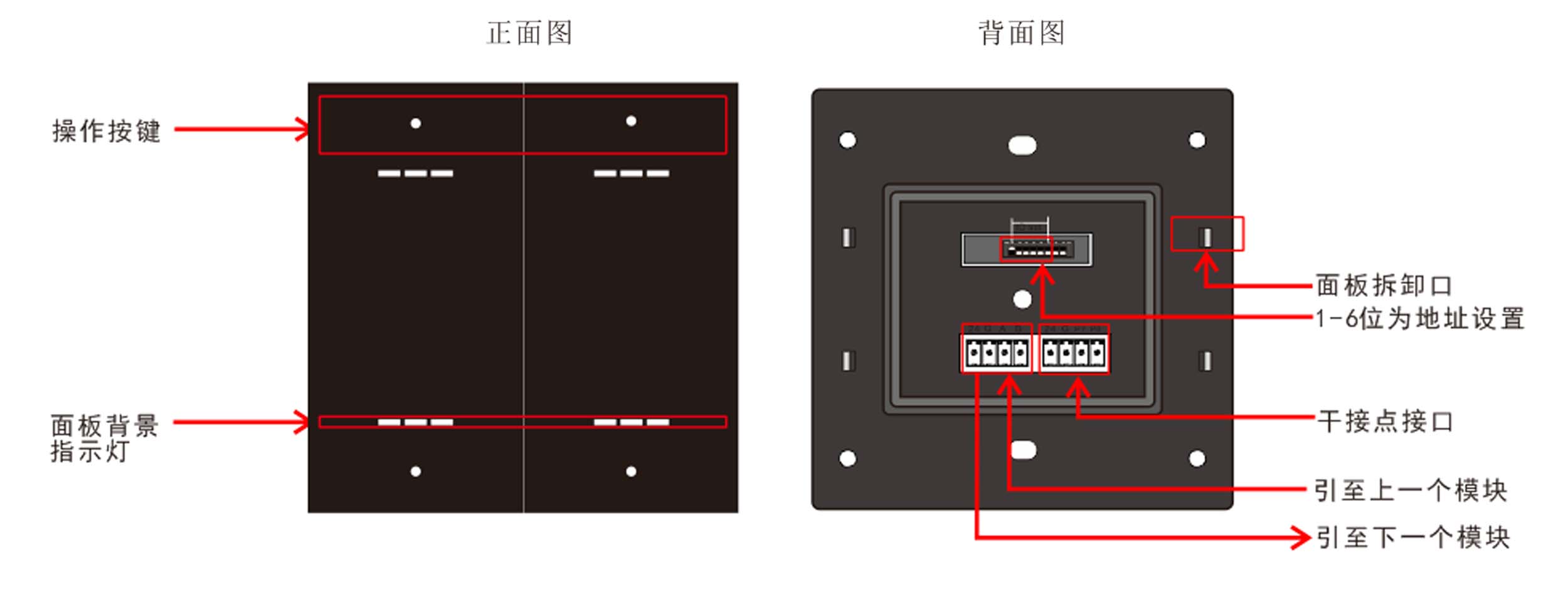 標(biāo)準(zhǔn)86底盒安裝,支持無縫聯(lián)接,提供4鍵,每個按鍵帶1路LED指示燈,復(fù)位式輕觸開關(guān),結(jié)構(gòu)成熟,性能穩(wěn)定,標(biāo)準(zhǔn)工藝,采用塑料材質(zhì)(顏色可選灰色、黑色和香檳金);自帶感應(yīng)式背光燈;提供兩路IO輸入可外接傳感器。